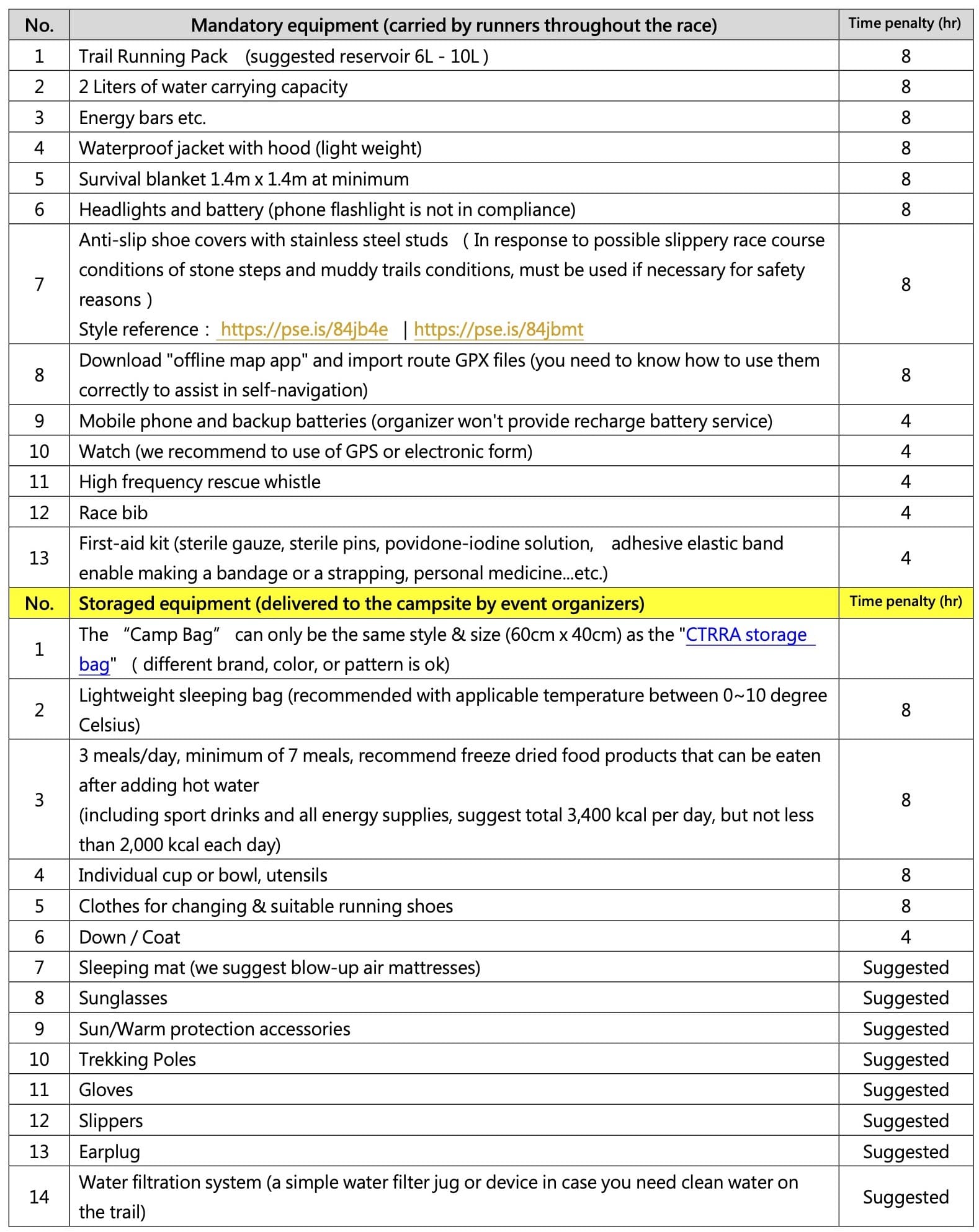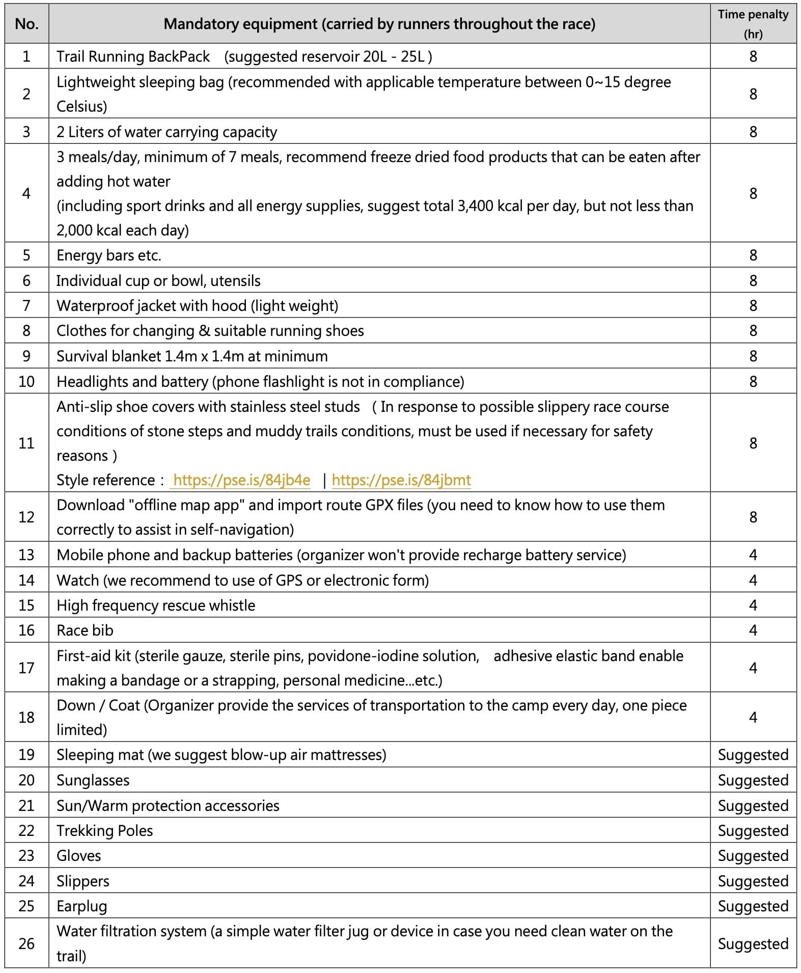 - The sum of total individual running times of each segment of the race will be used to calculate final rankings. Participants should pay attention to start times to avoid affecting personal time records; race participants must carry all mandatory equipment of the race as event staff will conduct random equipment inspections at each CP station. If it is discovered that mandatory equipment regulations have been violated, this will result in disqualification.